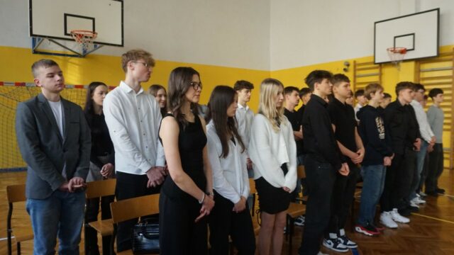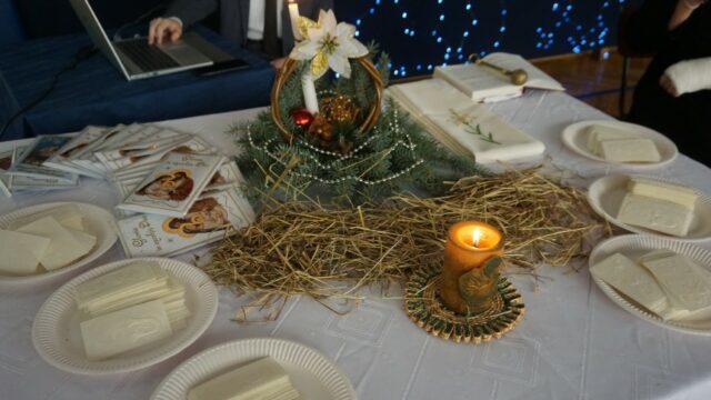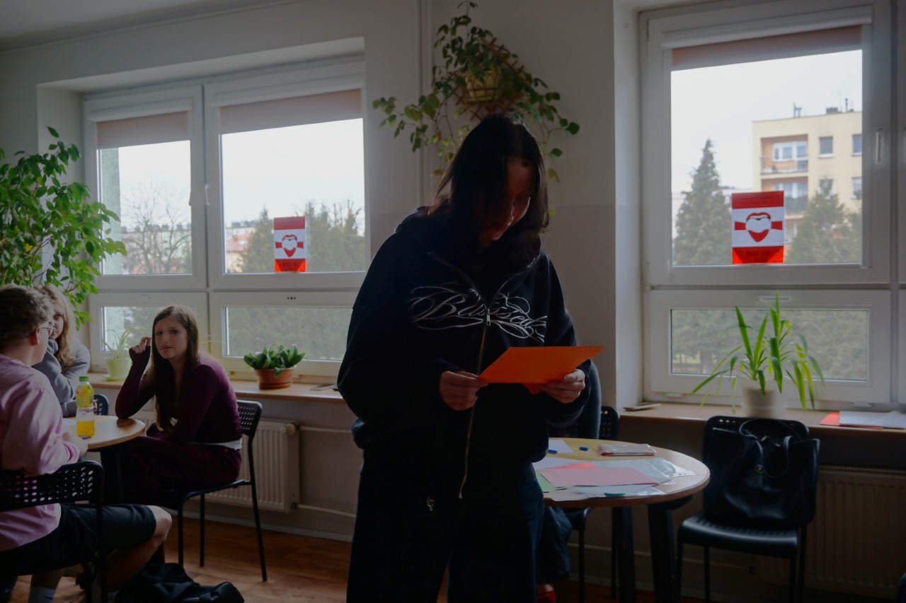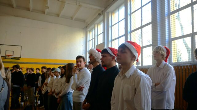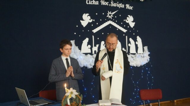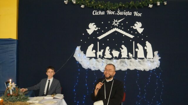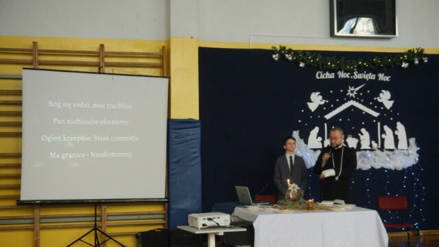 Dziś, punktualnie o godzinie 9.00, społeczność naszego liceum zgromadziła się w hali sportowej, aby wziąć udział w spotkaniu opłatkowym. Poprowadził je ksiądz Bartosz Bąk, który skierował do zebranych kilka okazjonalnych słów. Życzył, aby te święta były czasem spokoju i refleksji, spełnienia marzeń; zachęcał do podążania za głosem serca, niezrażania się porażkami, które należy traktować jako cenne życiowe lekcje. Następnie odczytał fragment „Ewangelii św. Łukasza” i zaprosił wszystkich do wspólnej modlitwy oraz kolędowania. Następnie głos zabrał dyrektor szkoły p. Marek Niemczura, życząc nauczycielom i młodzieży zdrowych, spokojnych świąt Bożego Narodzenia oraz szczęśliwego Nowego Roku. Po części oficjalnej uczniowie udali się do swoich klas, by zasiąść przy uroczyście zastawionym wigilijnym stole.