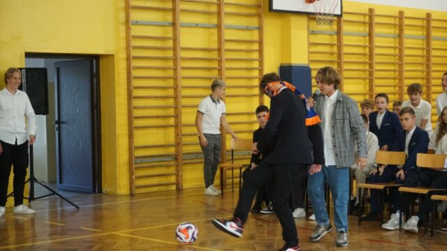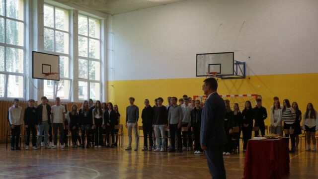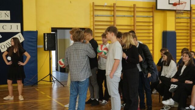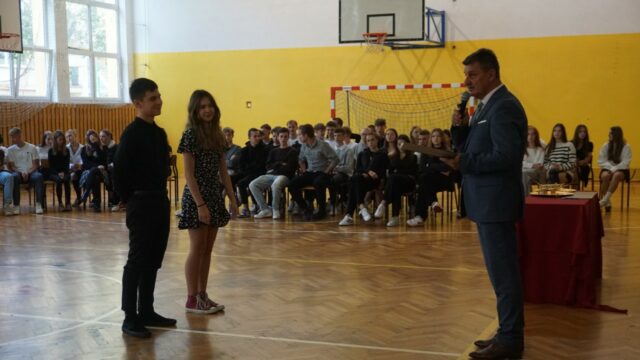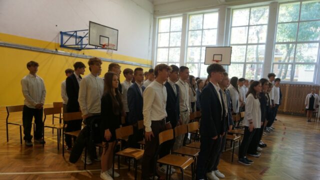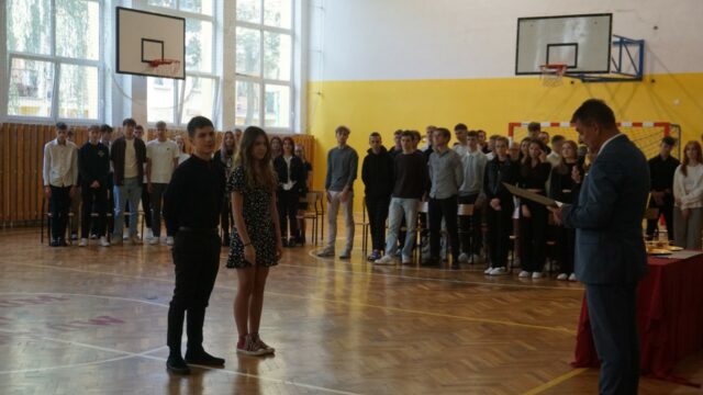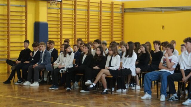 Druga część spotkania była dedykowana uczniom klas pierwszych. Najpierw złożyli oni uroczyste ślubowanie, a następnie przeszli chrzest bojowy, starując w konkurencjach przygotowanych dla nich przez uczniów z klas drugich. W pierwszym etapie odpowiadali na pytania dotyczące swojej nowej szkoły, tu lepsza okazała się 1A, zaś później musieli się wykazać sprawnością fizyczną, co sprawiło mniej kłopotu 1B. Ostatecznie decyzją przewodniczącego szkoły pierwszoklasiści zostali przyjęci do licealnej społeczności.