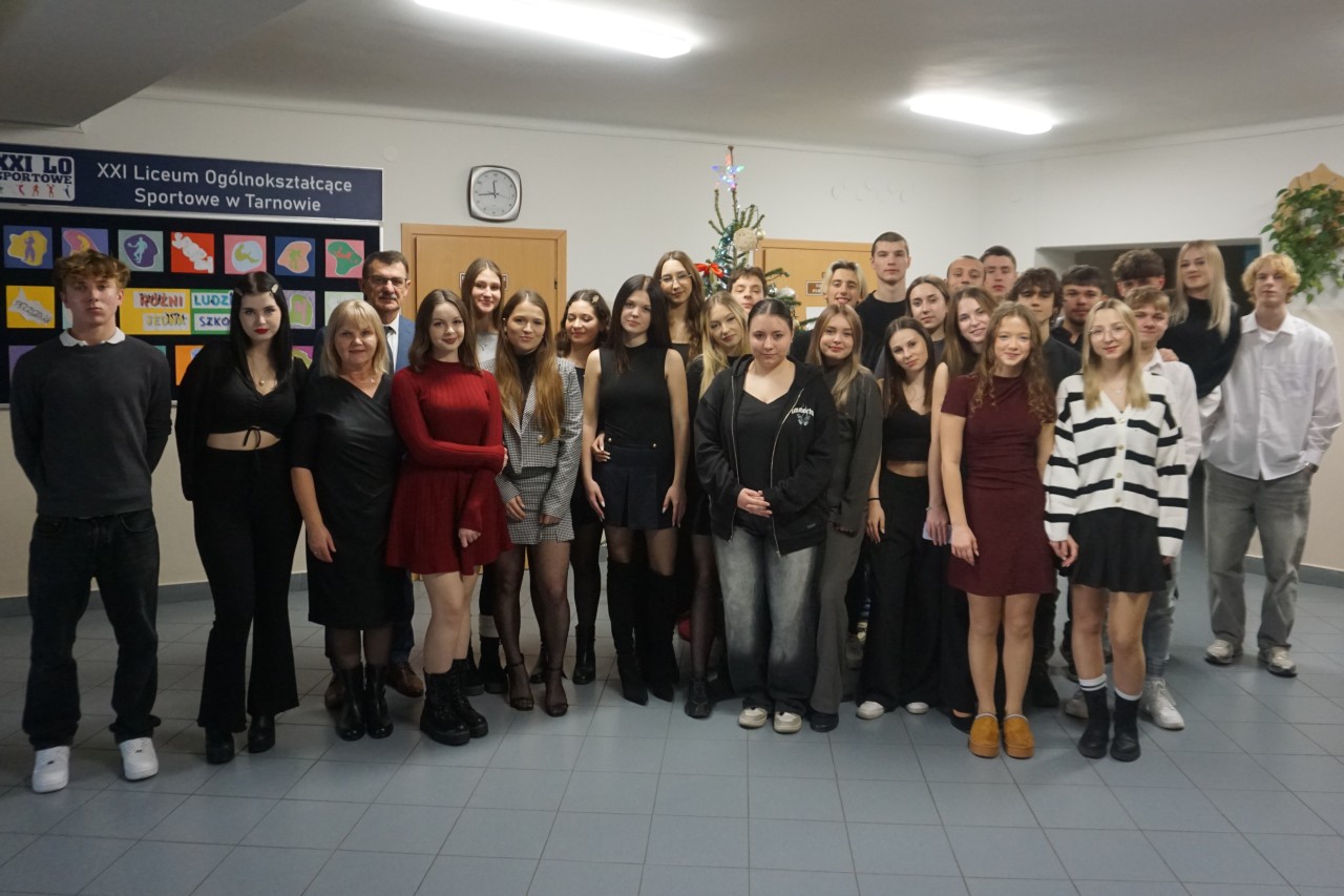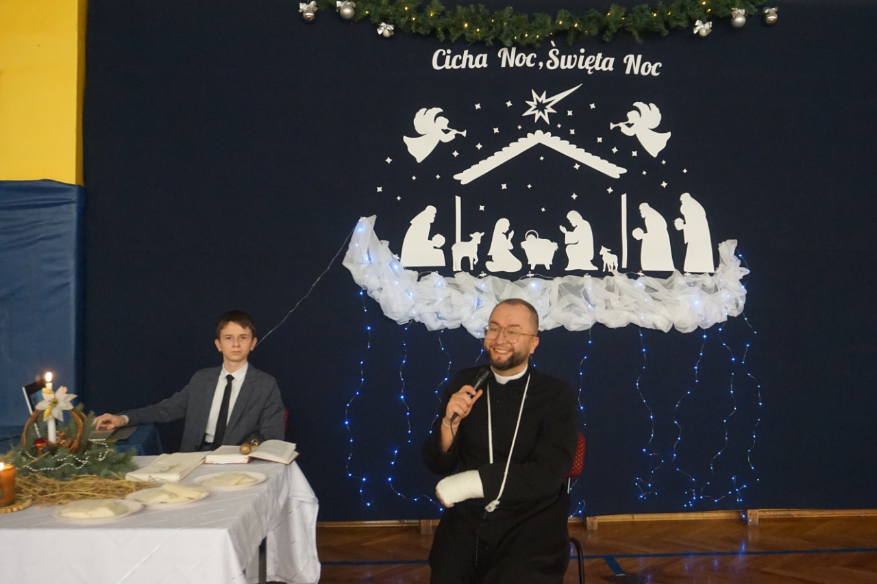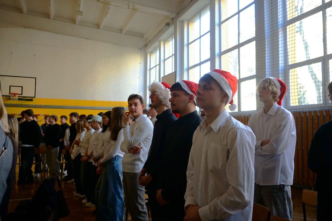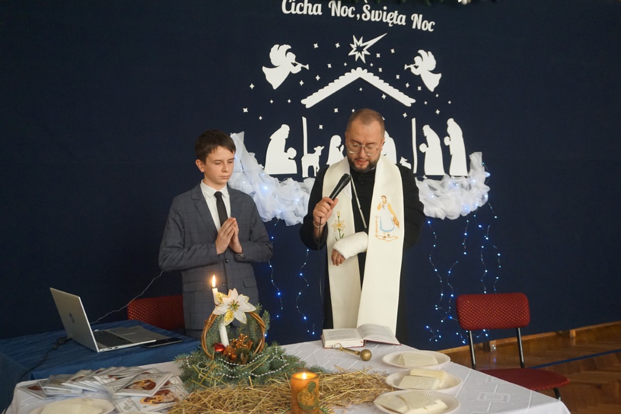 Dziś, punktualnie o godzinie 9.00, społeczność naszego liceum zgromadziła się w hali sportowej, aby wziąć udział w spotkaniu opłatkowym. Poprowadził je ksiądz Bartosz Bąk, który skierował do zebranych kilka okazjonalnych słów. Życzył, aby te święta były czasem spokoju i refleksji, spełnienia marzeń; zachęcał do podążania za głosem serca, niezrażania się porażkami, które należy traktować jako cenne życiowe lekcje. Następnie odczytał fragment „Ewangelii św. Łukasza” i zaprosił wszystkich do wspólnej modlitwy oraz kolędowania. Następnie głos zabrał dyrektor szkoły p. Marek Niemczura, życząc nauczycielom i młodzieży zdrowych, spokojnych świąt Bożego Narodzenia oraz szczęśliwego Nowego Roku. Po części oficjalnej uczniowie udali się do swoich klas, by zasiąść przy uroczyście zastawionym wigilijnym stole.